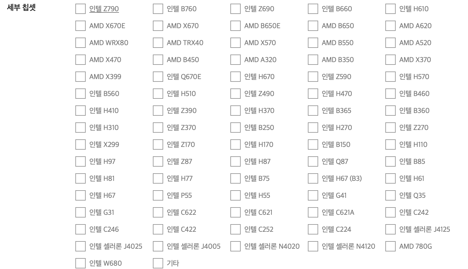 위의 사진을 보면 진짜 칩셋이 겁나게 많다. 이 많은 종류 중에 뭘 어캐 알아서 골라요... 라고 할 필요 없다. 어차피 위에 검색조건처럼 대부분 구분도 되어있는데다, 그냥 우린 일단 몇가지만 기억하면 된다.크게 말하면 Intel CPU 에 사용되는 칩셋과 AMD CPU에 사용되는 칩셋이 다르다는 것인데..